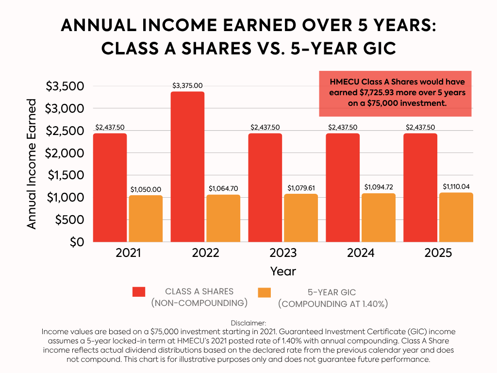 Class A Shares are available to HMECU Members only. The income earned on Class A Shares is taxed as interest, whereas income earned on common shares is taxed as dividends. Class A Shares cannot be traded on the stock market.